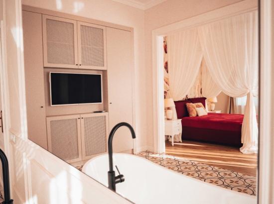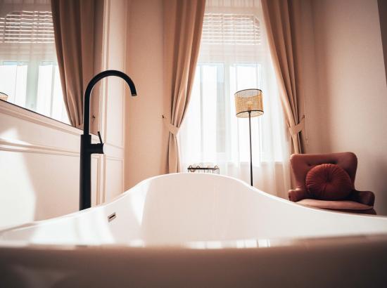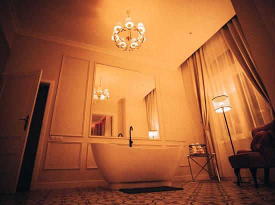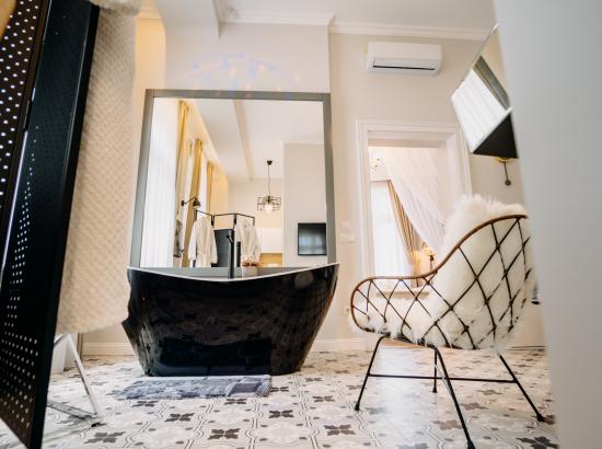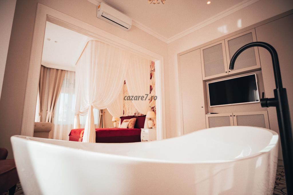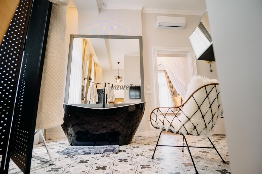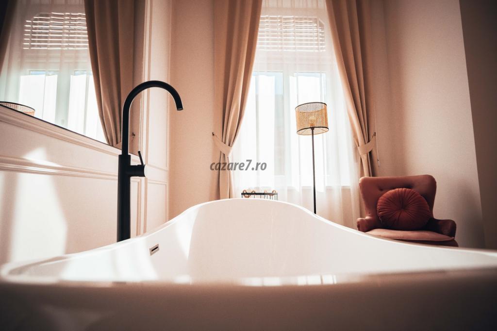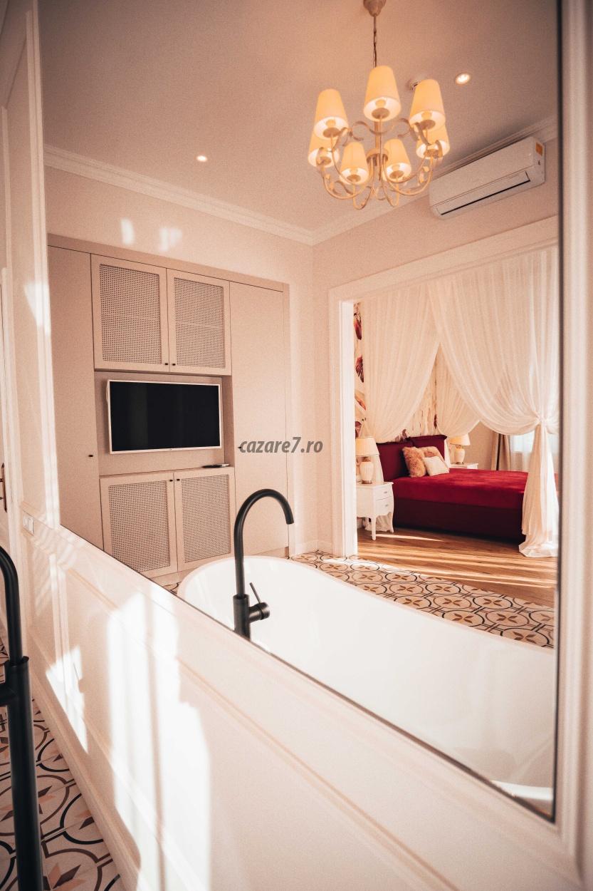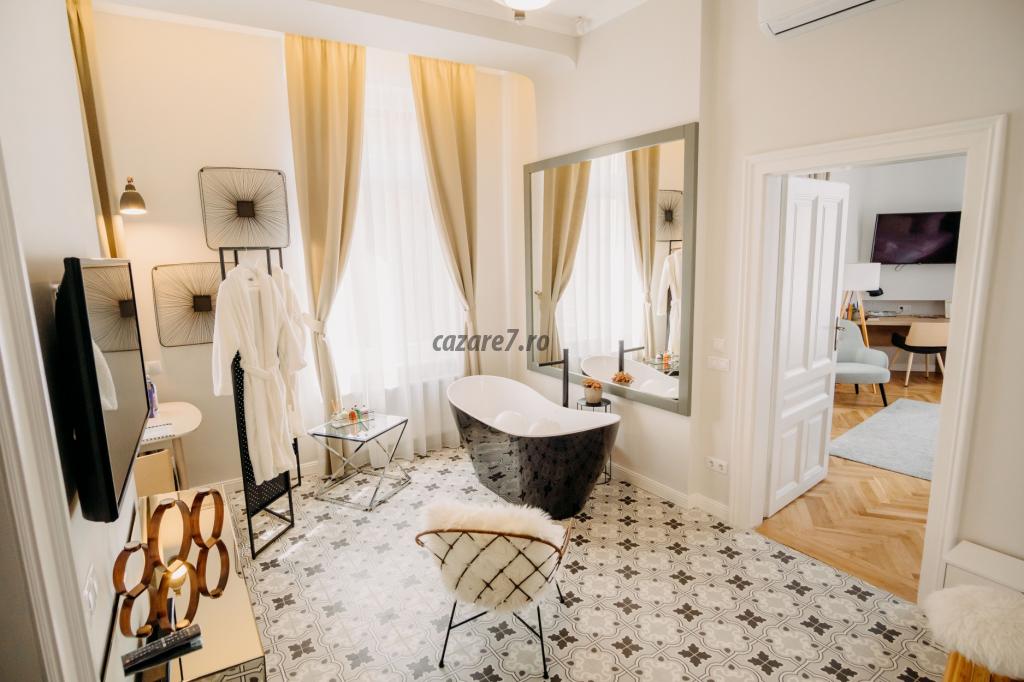 Livingul este dotat cu o cada pentru doua persoane, o oglinda uriasa, prosoape si diferite saruri de baie pentru o relaxare cat mai placuta. Incaperea beneficiaza de iluminat ambiental reglabil cu LED-uri si spot-uri. Totodata, v-am pregatit si halate de baie pe care le gasiti în dulap, putand fi purtate dupa baie cand doriti sa va relaxati în apartament la micul dejun sau in timp ce savurati o cafea pe balcon.