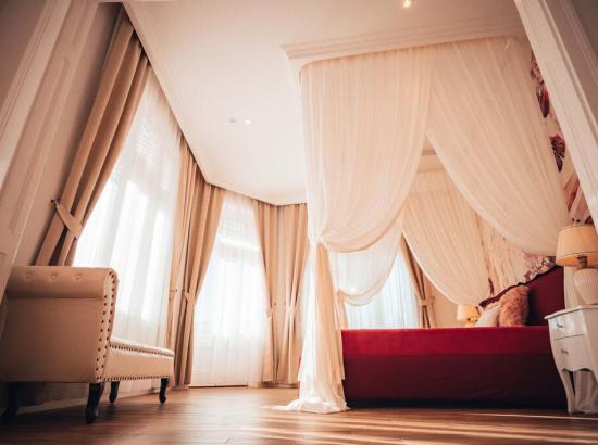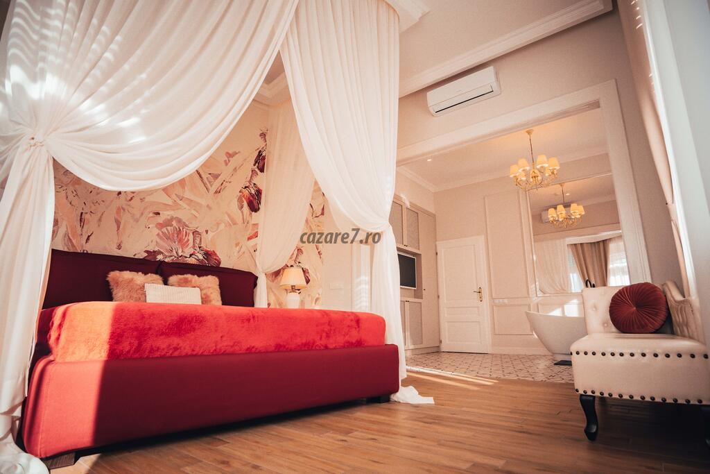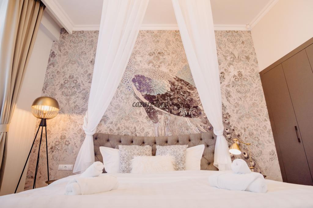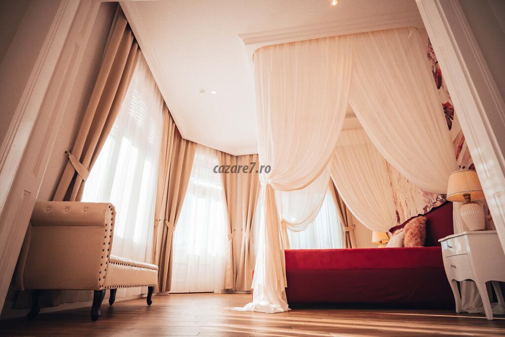 Elementul care cu siguranta va atrage cele mai multe priviri este un pat dublu (200 cm/220 cm), comod si incapator, inconjurat de un baldachin suspendat la 3 metri inaltime, completat cu veioze in stil clasic. Banda LED care ilumineaza baldachinul si zona de dormitor in 6 culori diferite se regleaza cu ajutorul unei telecomande.