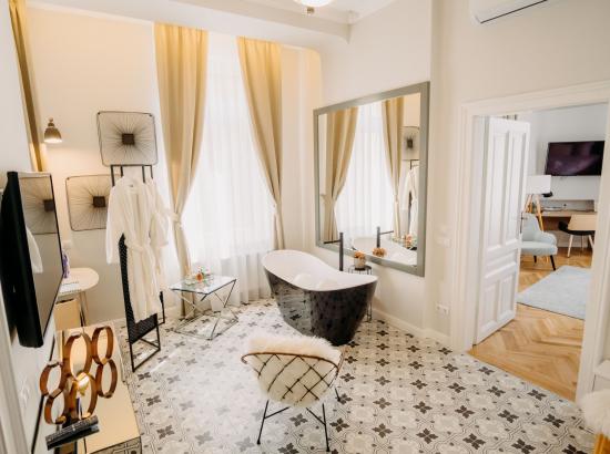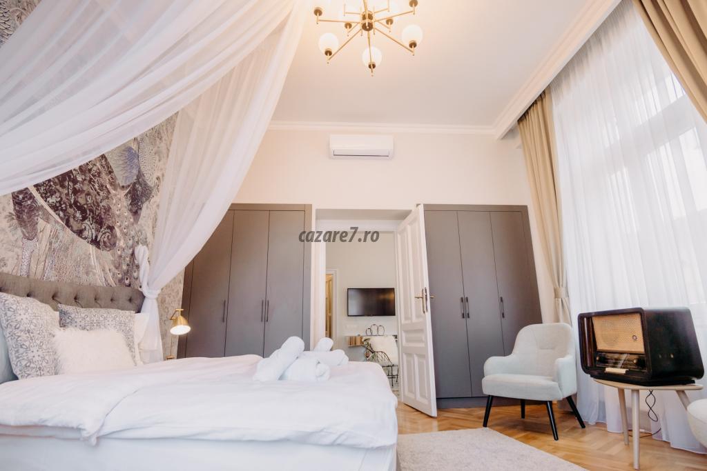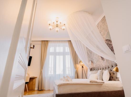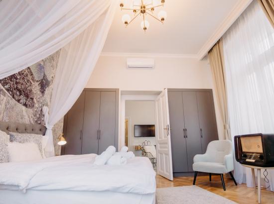 Apartamentul Elegant se află la primul etaj al clădirii și combină atmosfera contemporană și modernă din Oradea cu izul de epocă al palatului, care se păstrează de mai bine de 100 de ani. Apartamentul Elegant dispune de o bucătărie, un dormitor și o baie cu o suprafață de locuit de 60mp. Aici putem găzdui confortabil 2-3 persoane.