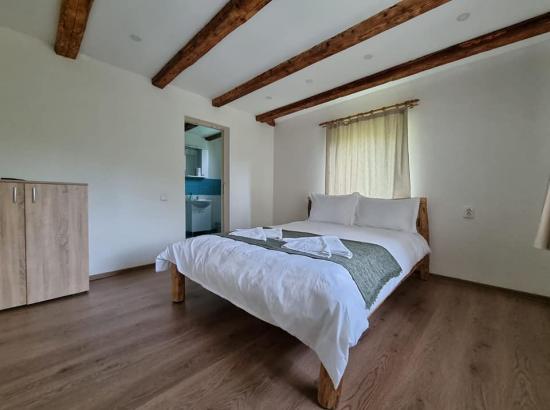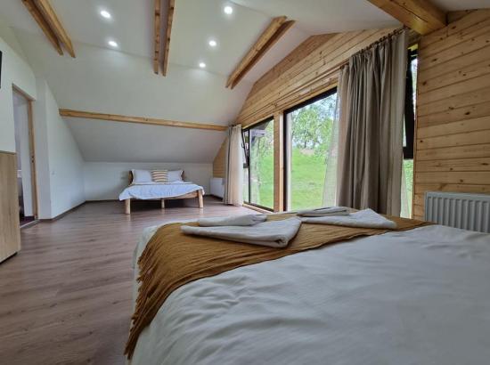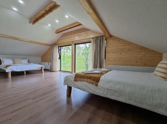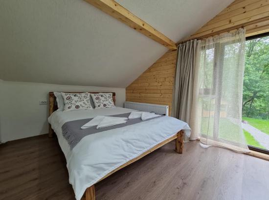 Cabana de lângă râu ofera cazare in 4 camere moderne si spatioase, 2 dintre ele dotate cu cate 2 paturi matrimoniale, si 2 camere duble cu cate un pat matrimonial, toate dispunand de televizor led si grup sanitar propriu. Incalzire centrala si apa calda permanent. Cabana dispune de o bucatarie complet dotata si utilata, living spatios cu televizor led, balcon, foisor cu gratar, parcare proprie, sezlonguri si internet wireless.