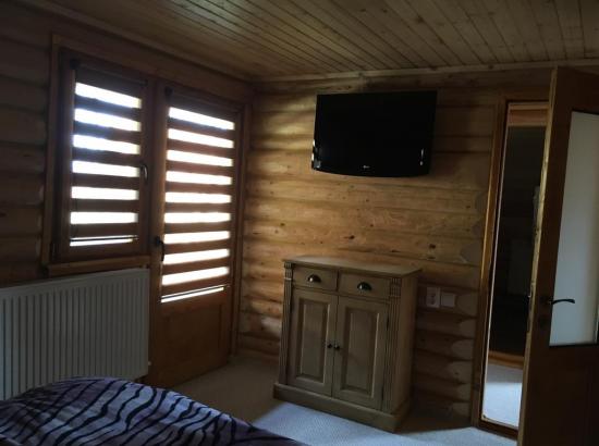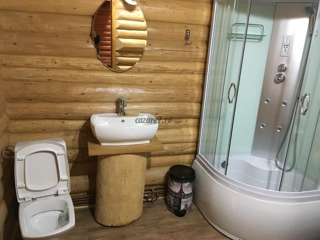 Bucătărie: frigider și congelator, mașină de spălat vase, cuptor electric, plită cu inducție, insulă, chiuvetă uscător, scaune de bar, ambiantă. Baia de jos complet utilată cu mașină de spălat haine, uscător, apă caldă NON STOP, scară interioară pentru urcarea la mansardă unde găsim 4 dormitoare 14-16 mp cu pat matrimonial king size, televizor și ieșire la balcon noptiere și comodă. Intrarea în cabană se face printr-o terasă cu suprafața de 30 mp utilată cu masă și bănci cu vedere la lacul din fața cabanei, râu și pădure.